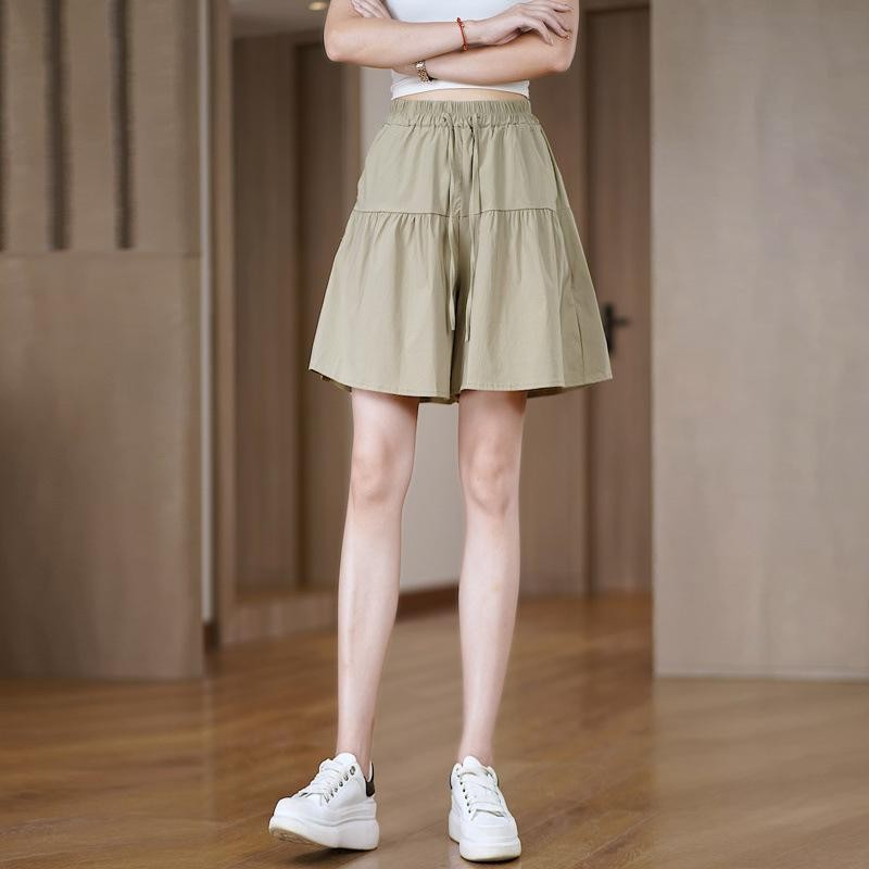 Thiết kế: Quần đùi giả váy ngắn (dài ~38–42cm), nhún xòe 2 tầng bồng bềnh, cạp chun cao 5cm + dây nơ buộc, 2 túi thật sâu