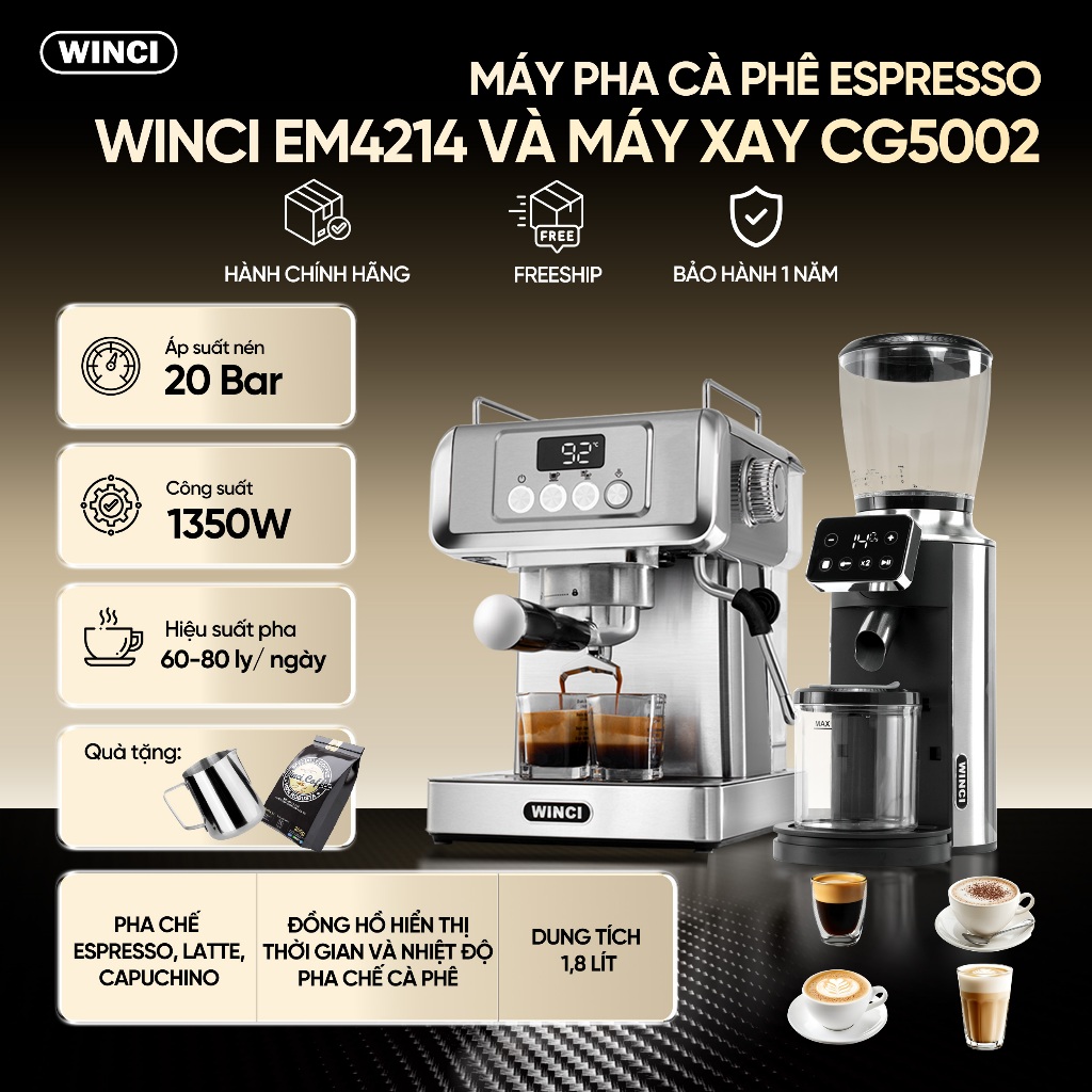 COMBO Máy pha cà phê Winci EM4212 và Máy xay cà phê Winci CG5002, dùng cho gia đình