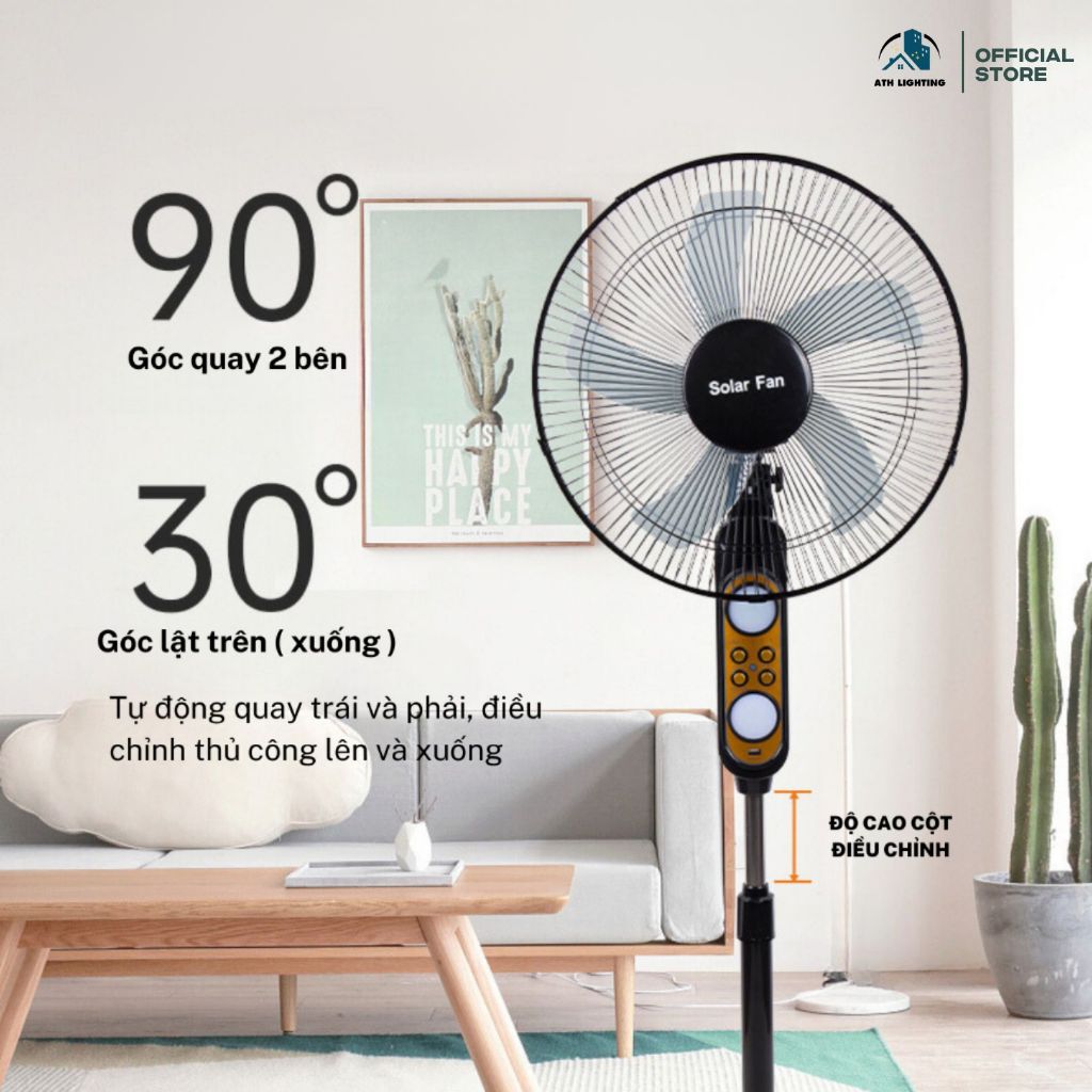 - Quạt Năng Lượng Mặt Trời: có điều khiển từ xa với 3 cấp số và nút bấm