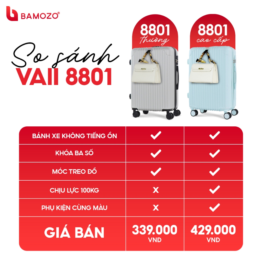*** THÔNG SỐ VALI BAMOZO 8801 - Thương hiệu: Bamozo. - Model: 8801. - Màu sắc: Hồng nhạt, xanh nhạt, vàng hồng, bạc, đen. - Kích thước size 20: 36.5cm x 22cm x 53cm(+/- 2cm): có thể xách tay lên máy bay, sức chứa 7-12kg hành lý, thích hợp cho những chuyến du lịch ngắn ngày 2-4 ngày hoăc đi công tác. - Chất liệu: Nhựa ABS cao cấp.