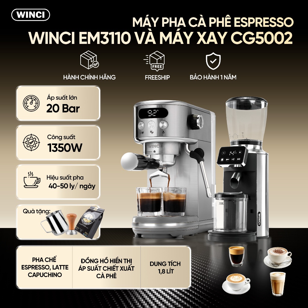 Sản phẩm: Máy pha cà phê Thương hiệu: Winci Mã sản phẩm: EM4212 Dung tích bình chứa nước:1.8 lít Màu sắc:Trắng Chất liệu: Nhựa ABS + Inox Công suất: 1450W Kích thước: 270*240*308 mm Điện áp: 220-240V Áp suất máy bơm: 20 Bar Tay cầm: 51mm
